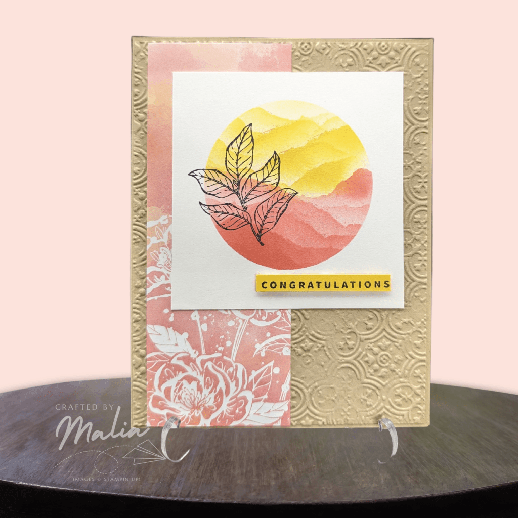 I was shocked at how easy this card was to make. I think it looks really complicated! It’s like there’s a sunset over mountains or something. But it was simple and really fun. All you need is blending brushes, a mask, a torn piece of paper, and two ink pads.