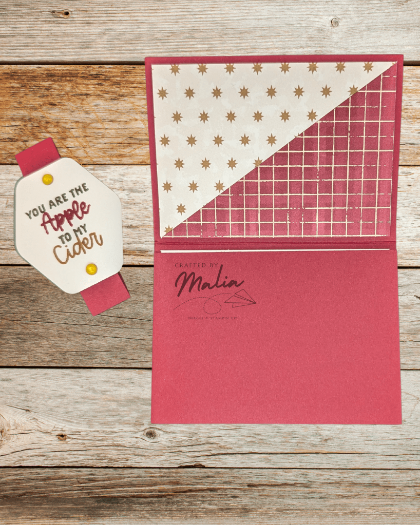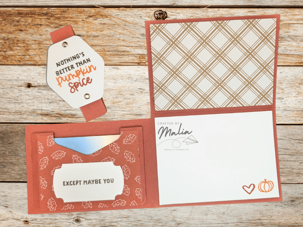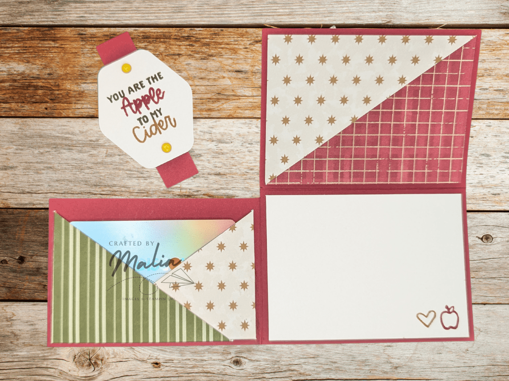 This holder unfolds twice and has a belly band to keep it secure. It nicely holds a gift card and has a small place to write a note to the recipient. I think it’s a fun alternative if you’re tired of making standard sized cards.