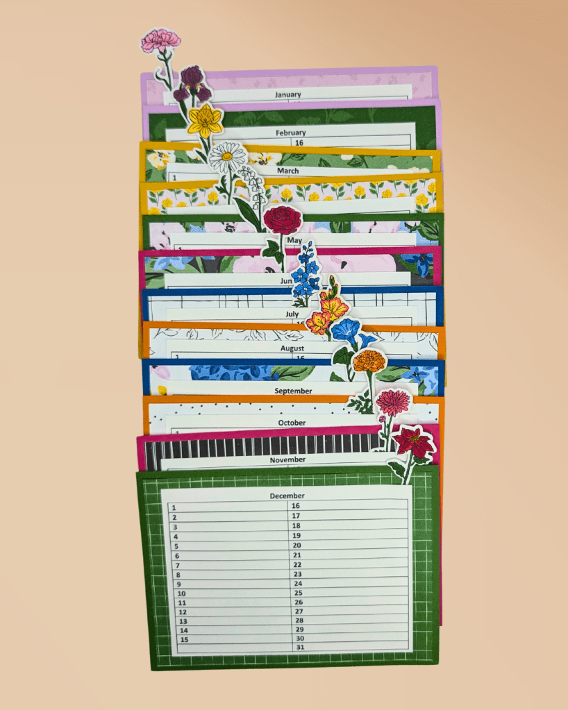 I had the idea for this project when I saw the Year of Flowers bundle that came out with this month’s Online Exclusives. I love the idea of birth flowers and flower meanings, and I knew I wanted to do something with this set. I love how the calendar looks like a flower garden, and it was fun looking up all of the flowers to decide how to color them.