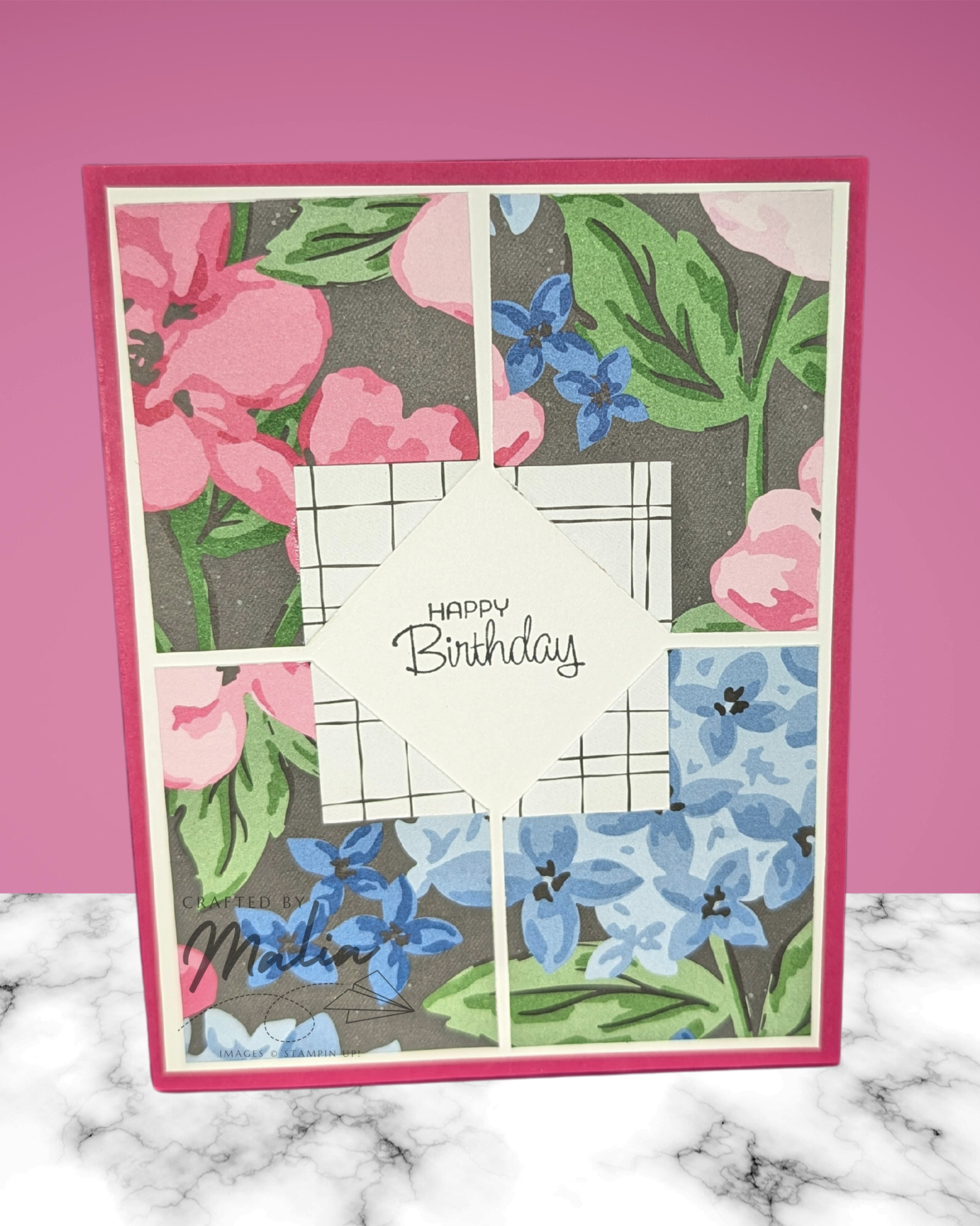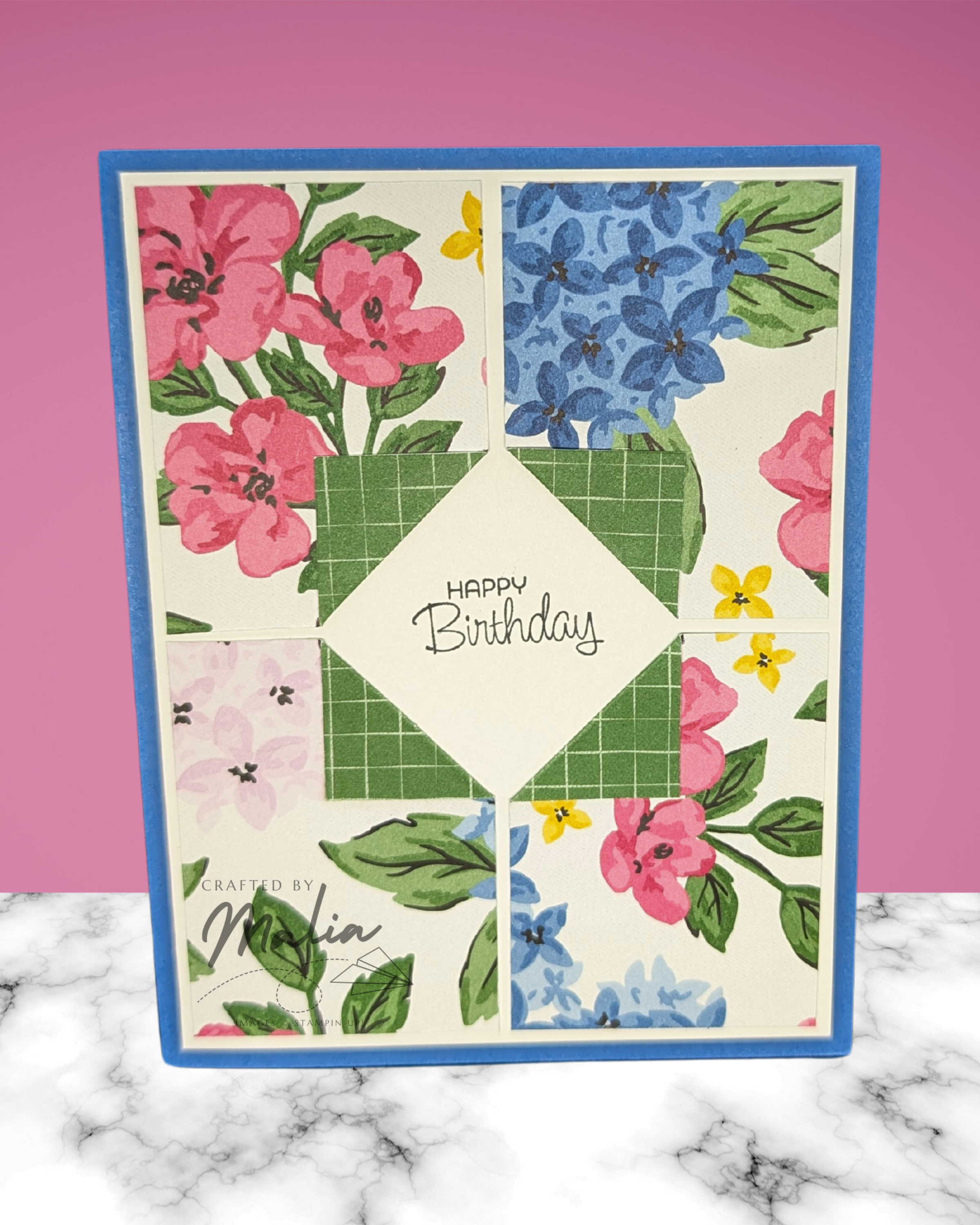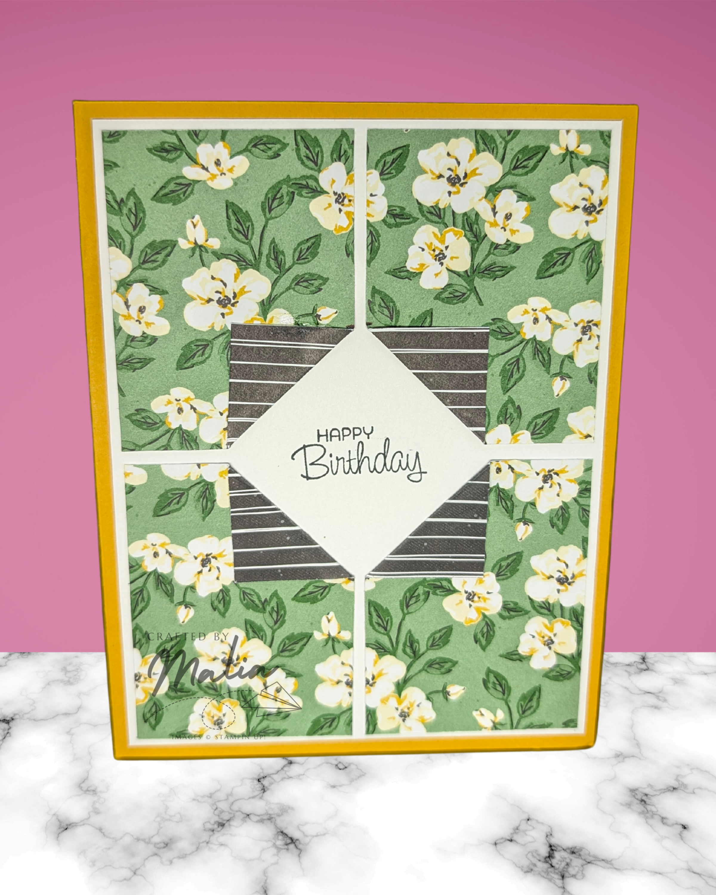 This is a design that I’ve seen called the “Peek-A-Boo Card.” It is super simple — just fold the corners of patterned paper up and stamp something in the center! It’s quick, easy, and striking.
