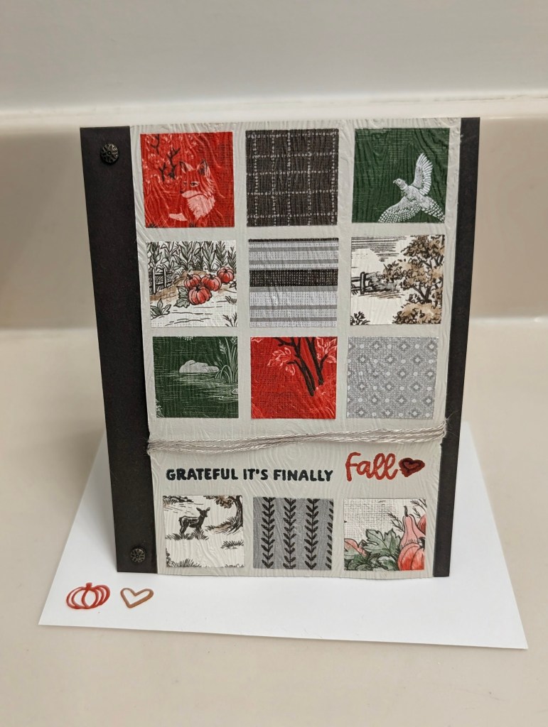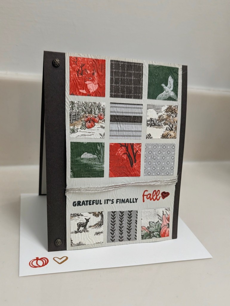 This is such a simple design but I love how it turned out! You just need 12 1″ x 1″ squares of DSP and a 5 1/2 x 3 1/2 piece of background. I ran the whole thing through an embossing folder just to give it a little something.